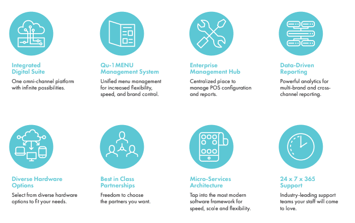In addition to its API-first architecture, Qu delivers an omni-channel ordering solution that enables order taking anywhere, anytime; a modern, gesture-based, conversational ordering design that delights staff and increases order accuracy; a cloud-deployed, but not cloud-dependent, architecture that keeps working even when the internet or cloud goes down; a rugged hardware platform that has been restaurant proven for decades; a virtual store-grouping model that eases enterprise management, and the ability for clients to choose their payment processor.